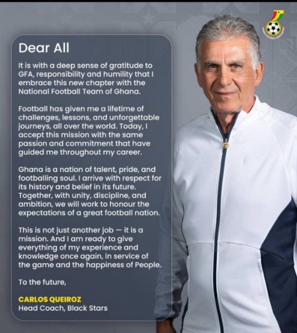 In his first message to Ghanaians, Queiroz struck a personal tone, “This is not just another job — it is a mission. Ghana is a nation of talent, pride, and footballing soul. Together, with unity, discipline, and ambition, we will work to honour the expectations of a great football nation.”