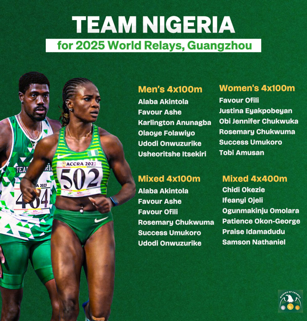 Tags: Athletics Federation of Nigeria, AFN, 2025 World Relays, Guangzhou, Olympics, Tobi Amusan, Favour Ashe, Chidi Okezie, Ifeanyi Ojeli, Patience Okon-George, Samson Nathaniel, Rosemary Chukwuma, Udodi Onwuzurike, Success Umukoro.