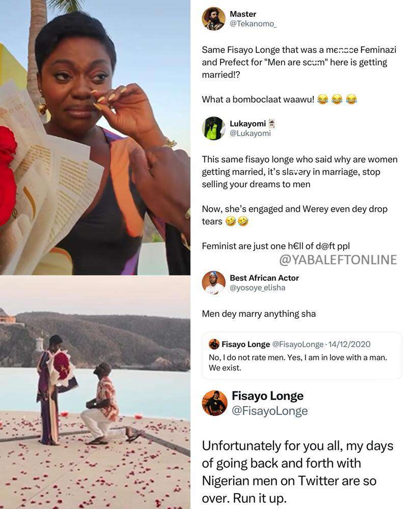Seriously, I did not know who Fisayo Longe was until she got proposed to a few days ago. It was supposed to be an ‘Awww, congratulations’ moment, but the comments section was full of criticisms. She is seen as a Twitter feminist-her ideologies that deem her as one were based on her indifference for the institution of marriage and disdain for men.