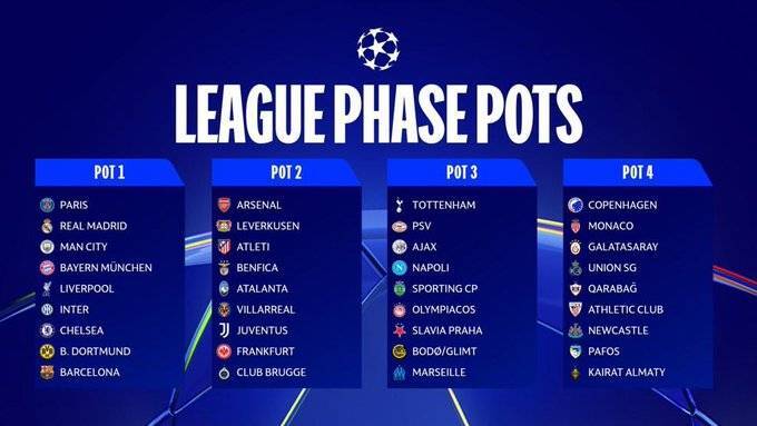 UEFA confirmed that the new league phase would feature 36 teams in a single table, with each club playing eight matches—four at home and four away—against opponents from four seeded pots.