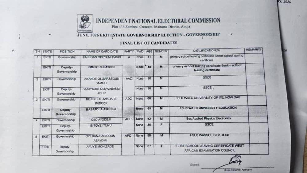 The Independent National Electoral Commission (INEC) has published the final list of candidates cleared to contest the 2026 Ekiti State governorship election, with the Peoples Democratic Party (PDP) notably absent.