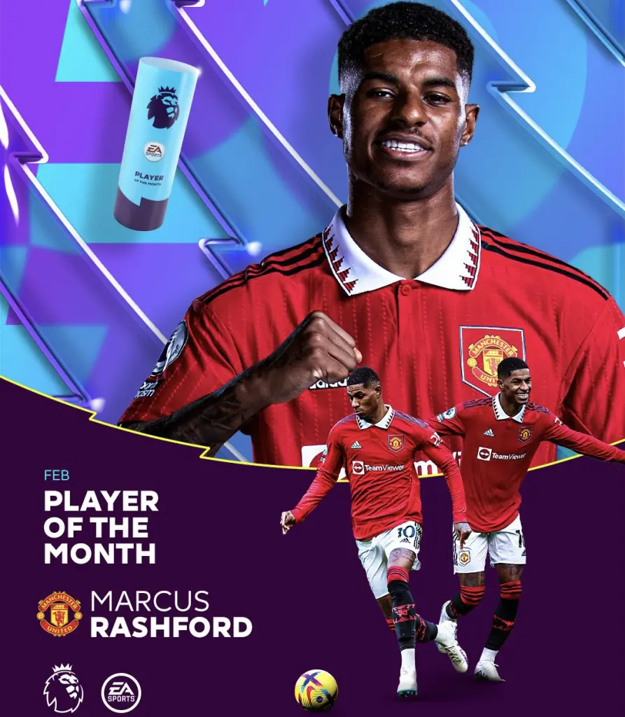 Manchester United forward, Marcus Rashford has been named the Premier League player of the month for February, equalling Mohamed Salah’s record for the most awards in a season.