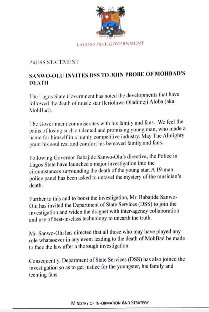 Lagos State Governor, Babajide Sanwo-Olu, has invited the Department of State Services (DSS) to join the investigation of the death of Ilerioluwa Oladimeji Aloba, aka Mohbad.