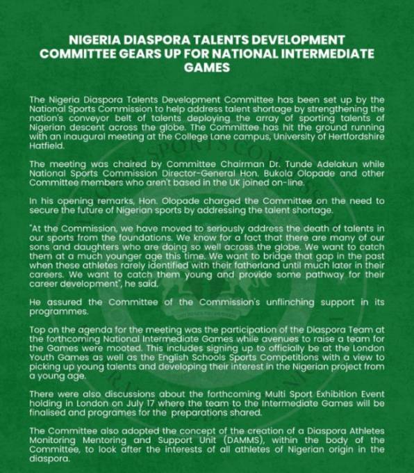 The National Sports Commission has announced the establishment of the Nigeria Diaspora Talents Development Committee, aimed at tackling the country’s talent shortage by engaging athletes of Nigerian descent across global platforms.