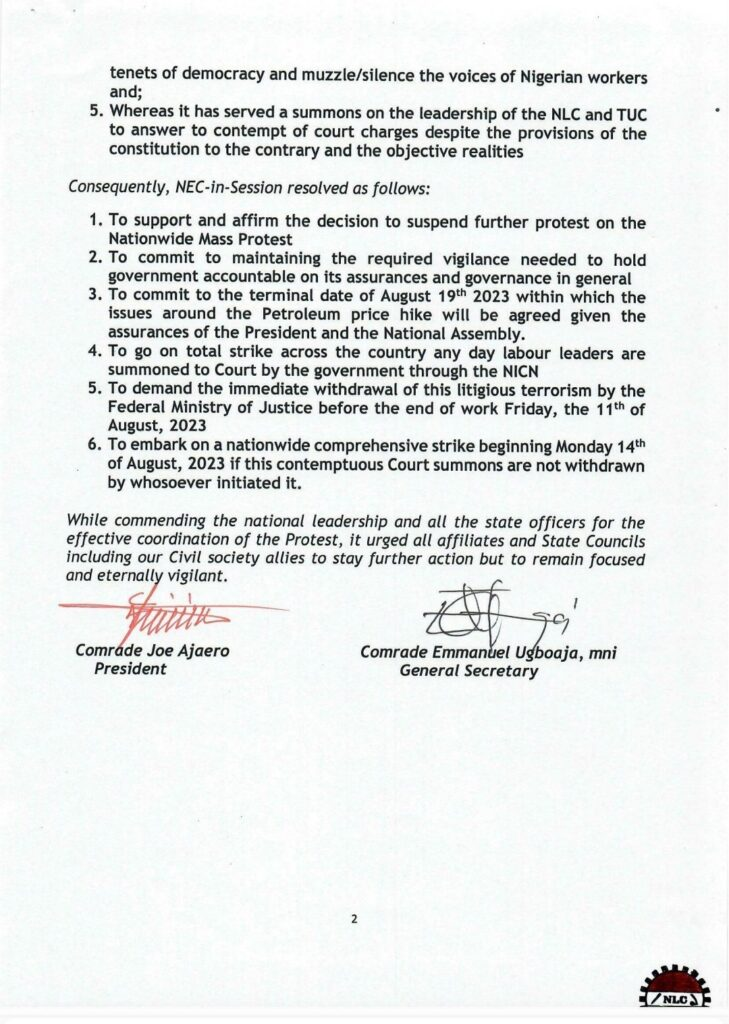 “To go on total strike across the country any day labour leaders are summoned to Court by the government through the NICN; to demand the immediate withdrawal of this litigious terrorism by the Federal Ministry of Justice before the end of work Friday, the 11th of August, 2023.