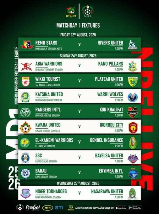The 2025/26 Nigeria Premier Football League (NPFL) season begins on Friday, August 22, 2025, marking the competition’s 54th edition and 36th since being professionalised.