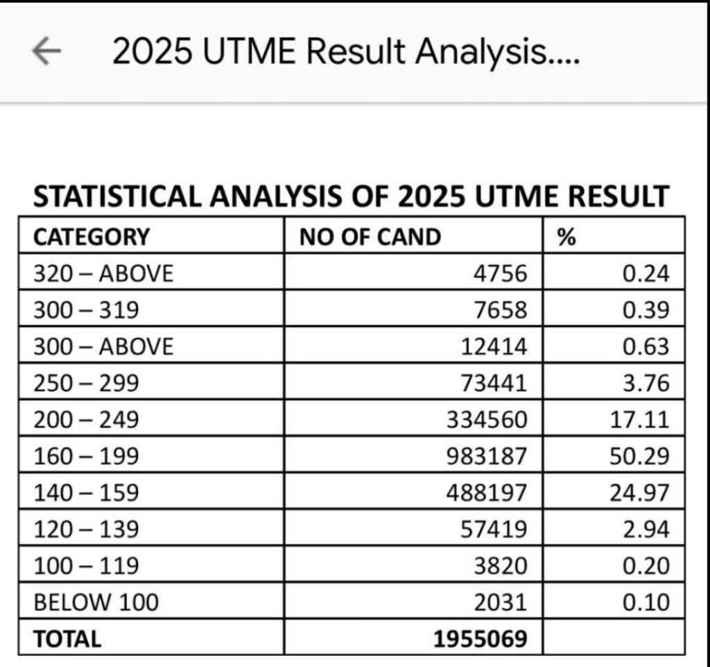 More than 1.5 million candidates who sat for the 2025 Unified Tertiary Matriculation Examination (UTME) scored below 200, according to new statistics released by the Joint Admissions and Matriculation Board (JAMB).
