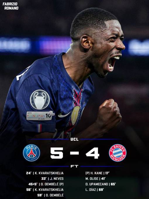The second half brought more chaos. Kvaratskhelia and Dembélé struck within two minutes of each other to make it 5-2. Bayern looked dead, but Upamecano and Díaz scored in quick succession to drag the tie back to 5-4.