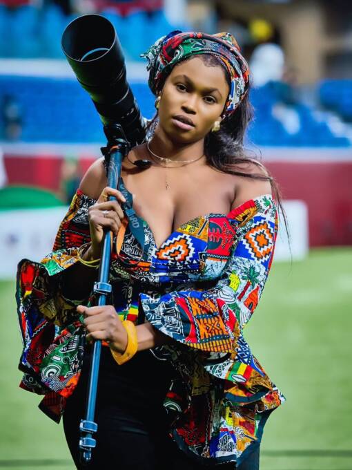 Other women, also photographers and others as broadcasters, worked nearby in team colours and African fabrics.