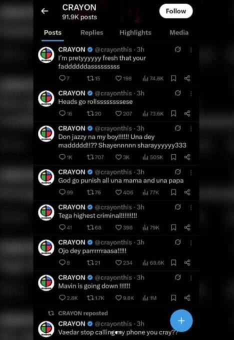 Taking a swipe at Don Jazzy, Crayon wrote, “Don Jazzy na my boy!!!!!! Una dey maddddd!!?? Shayennnnn sharayyyyyy333,” before turning to Tega with a harsher remark, “Tega highest criminal!!!!!!!!!”