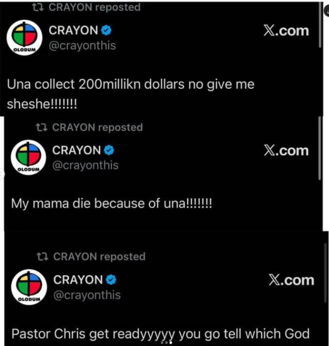 Taking a swipe at Don Jazzy, Crayon wrote, “Don Jazzy na my boy!!!!!! Una dey maddddd!!?? Shayennnnn sharayyyyyy333,” before turning to Tega with a harsher remark, “Tega highest criminal!!!!!!!!!”